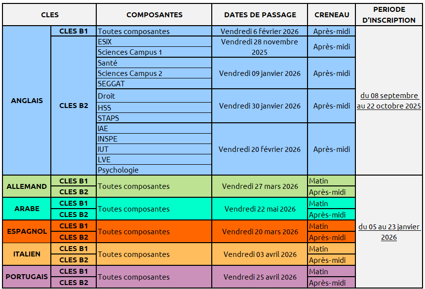 Elle permet d’évaluer les niveaux opérationnels de communication B1 et B2 pour les langues suivantes : anglais, espagnol, allemand, italien et portugais. Le certification CLES est valable à vie.
